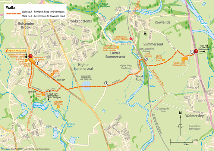 | Continue down Wood Road and through the hamlet at the bottom of the hill, also called ‘Wood Road.’ Shortly after leaving the hamlet the road crosses the River Irwell. Immediately before the bridge on the left there is a public footpath to Summerseat station and Garden Centre. |